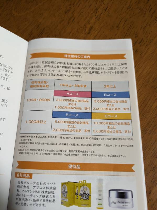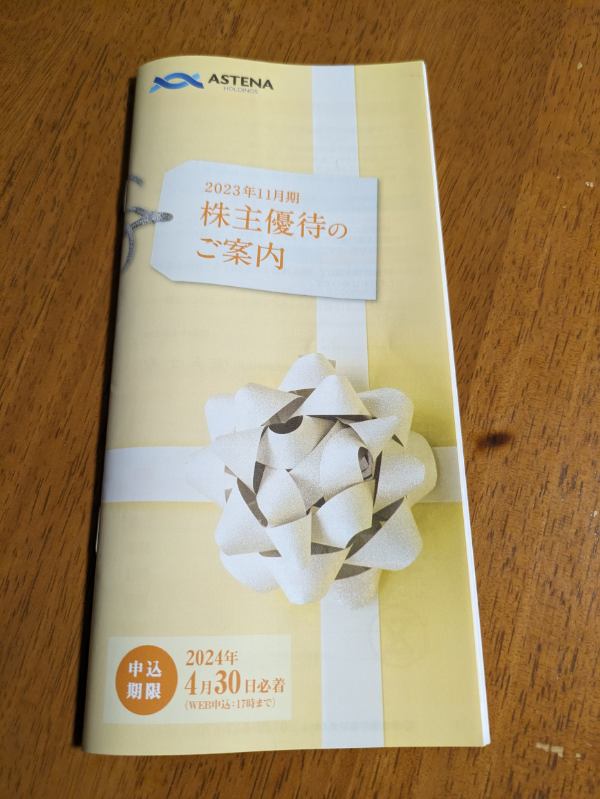 医療品等の卸から後発薬や表面処理薬の製造などを 行っているアステナホールディングス(8095)から 株主優待の案内が届きました~ 1年待って待望の優待Getですが…… 優待を貰うのに1年の保有条件があり 株を保有してからようやく1年が経過して 晴れて今年度から優待を貰えるように なって嬉しいんですが…… 優待好きな方はご存知な方も多いと 思われますが23年7月に優待の改訂が あり優待権利の条件が100株を 1年以上保有が500株を1年以上保有にと 厳しくなってしまいました(;゚ロ゚) 今年度までは100株で貰えるらしく 最初で最後の優待になりそうです泣