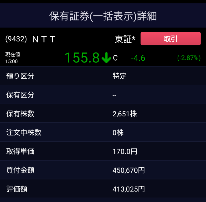 7月は+74株でした~ 先月が絶好と思ってましたが今月も 絶好の月でしたが 7月末からの日経株価の大暴落で…… 信用取引がえらいことになってまして(T-T) そっちの対処がおおわらわで 全然買えませんでした。 皆さんも信用取引気をつけてください。 本当にえらいことになります(/_;)