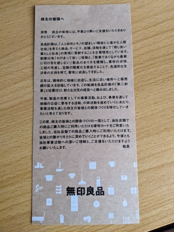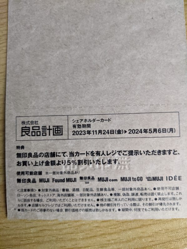 無印良品を運営する良品計画から優待が届きました。 無印良品の店舗で有人レジで提示すると5%割引になる 券になります。 権利確定月は、2月・8月で 100株保有で貰えます。 家族が無印良品が大好きでちょくちょく利用しています。 5%割引で大して大きくはありませんが 期間中は何度でも利用できるので助かります。 2023年12月時点での株価は2200円台です。